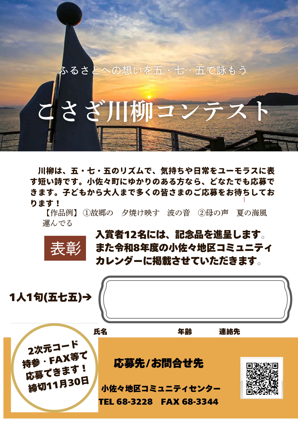 こさざ川柳コンテストにご応募を 2025 10/09 イベント情報 その他 小佐々地区コミュニティセンターでは、ふるさと小佐々への思いを詠んだ川柳(五・七・五の17音からなる定型詩)を募集しています。詳しくは下記のチラシをご覧ください。チラシの2次元コードからでもご応募できます。 イベント情報 その他 よかったらシェアしてね! URLをコピーしました! URLをコピーしました! 関連記事 小佐々地区親睦ソフトバレーボール出場チーム募集中!(2月22日開催) 2月15日、西の最果てマルシェを開催します! コミセン主催・スマホ講座を開催中! ふれあいコンサート・小佐々でJAZZ♪を開催! コミセン主催・会議の手法を学びました 小佐々の夜空に6年ぶりの花火のきらめき カヤックと水辺の安全教室を開催 6年ぶりに子ども劇場を開催