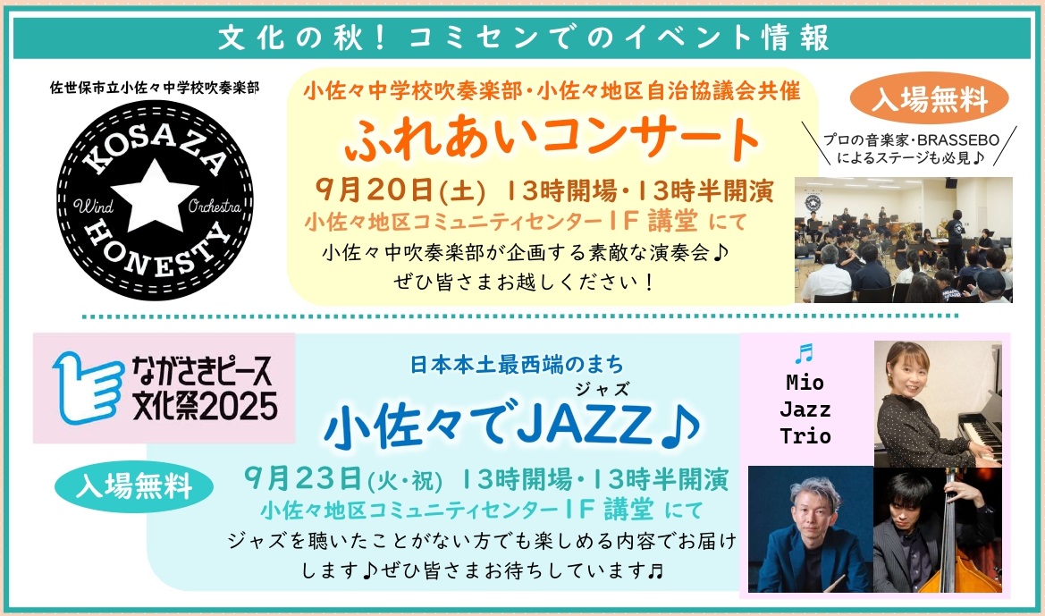 ★9月20日(土)小佐々自治協と小佐々中学校吹奏楽部が共催する『ふれあいコンサート』を今年も開催!今年はプロの音楽家BRASSEBO(ブラッセボ)や、小佐々コミセンの定期サークルで活躍中の唱歌を歌う会との合同ステージなど見どころ満載♪入場無料です。ぜひご覧ください♪