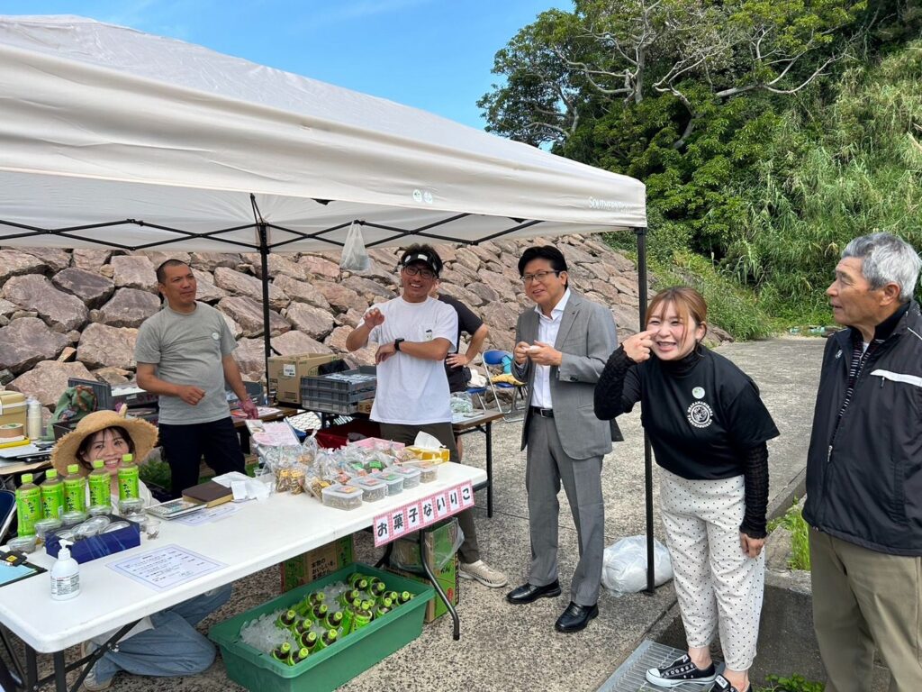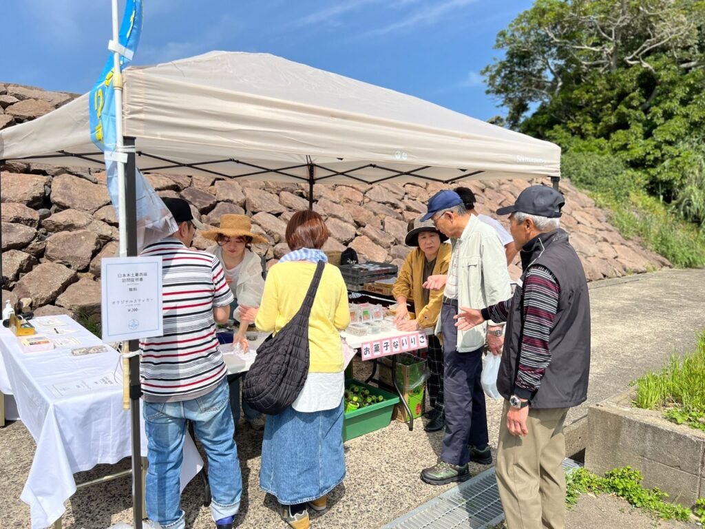 公園の一角では、小佐々地区自治協議会まちづくり推進チーム「コサザキタクブ」による最西端訪問証明書の交付や記念ステッカーの販売をはじめ、日本一の生産量を誇るイワシの加工品の販売や無料配布なども行われ、訪れた観光客をもてなしていました。
