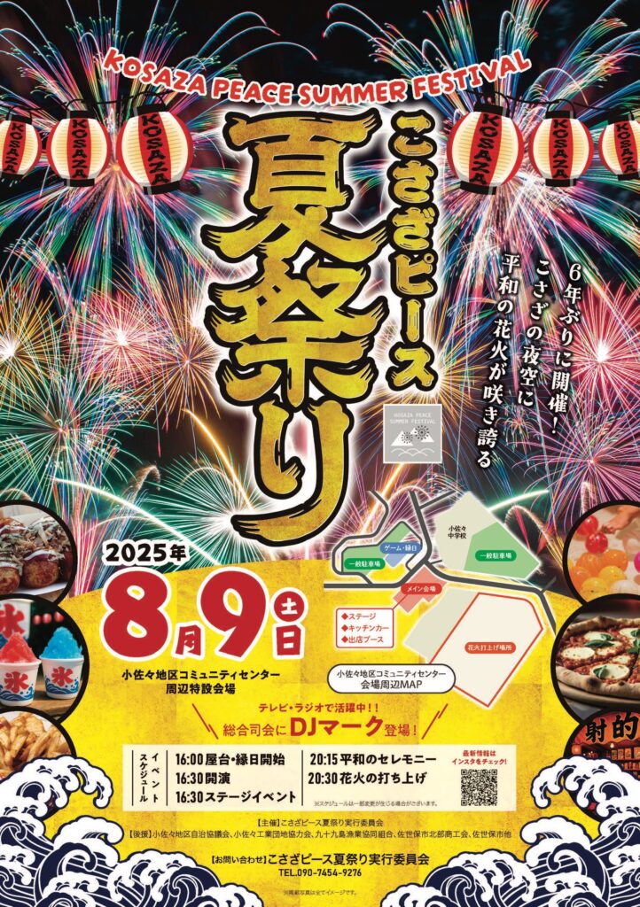 小佐々町で夏祭りが開催されます! 2025 8/28 イベント情報 その他 2025年8月22日2025年8月28日 6年ぶりに開催!こさざの夜空に平和の花火が咲き誇る♪ 【協賛金窓口】火曜日・金曜日9:00~17:00 小佐々地区自治協議会(コミセン2F事務室内)※ご持参・振込にて受付けしております。 問い合わせ・申込みは小佐々コミセンへ☎0956-68-3228 イベント情報 その他 よかったらシェアしてね! URLをコピーしました! URLをコピーしました! 関連記事 5月11日開催『西の最果てマルシェ』チラシができました 西の最果てマルシェ、2回目開催します! グッチョが優勝 ~親睦ソフトバレーボール大会 第2回親睦ソフトバレーボール大会のトーナメント決定しました スマホ教室を開催します 第2回小佐々地区親睦ソフトバレーボール大会を開催します! 新着コミセン講座情報 「コミ・フェスこさざ2024」を開催しました