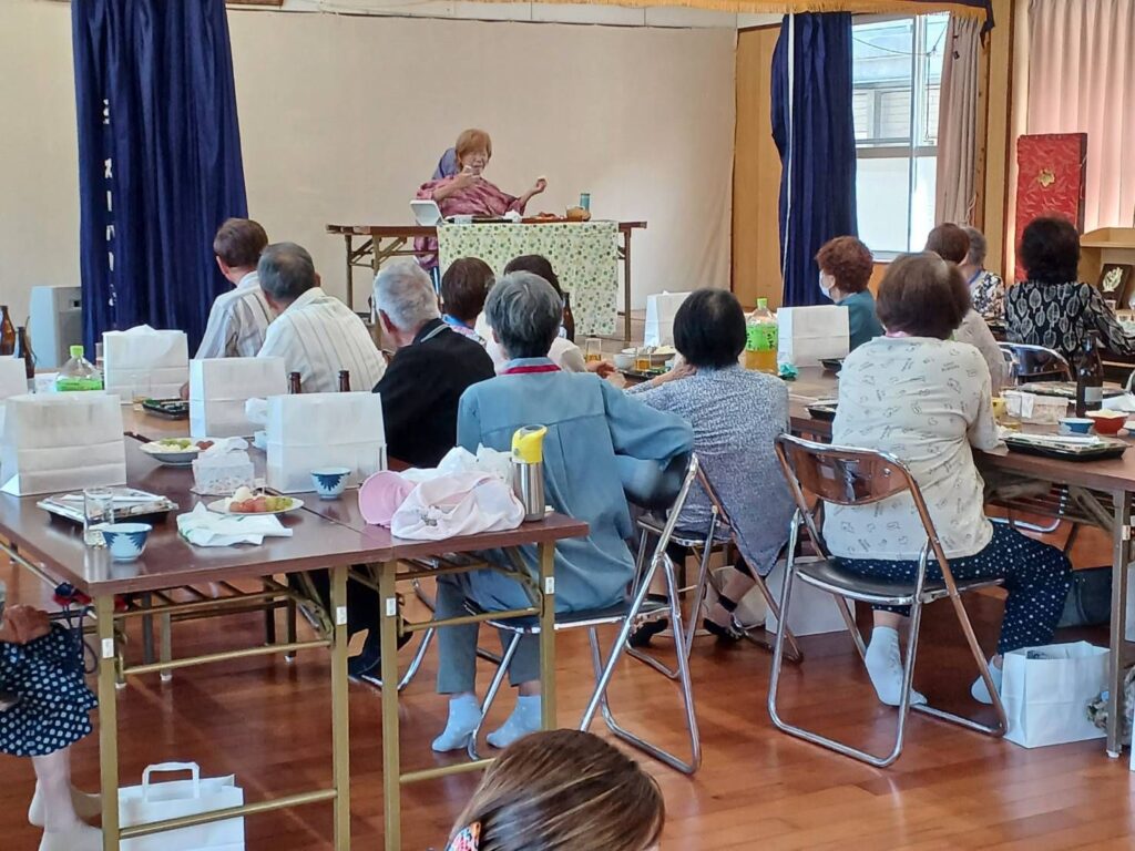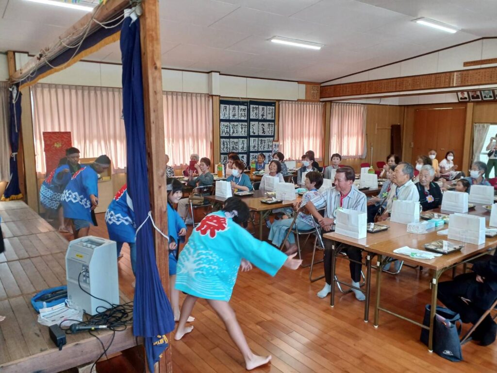 9月15日、町内各地区の公民館で敬老会が開催されました。このうち港町公民館では 70歳以上の高齢者25人が出席、子ども会の「よさこい」や二人羽織の熱演に出席者は大喜びのようでした。