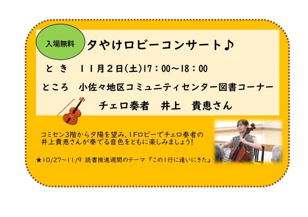 また夕方5時からは、「夕焼けロビーコンサート」を開催します。夕陽をみながら美しいチェロの音色で心を癒してみませんか。ご来場をお待ちしています。