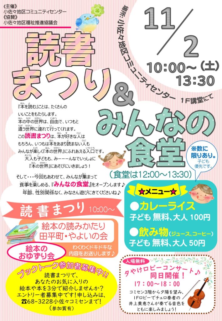11月2日、小佐々地区コミュニティセンターで絵本の読み語りなどを行う「読書まつり」、小・中・高校生を対象に無料でカレーライスをふるまう「みんなの食堂」を開催します。