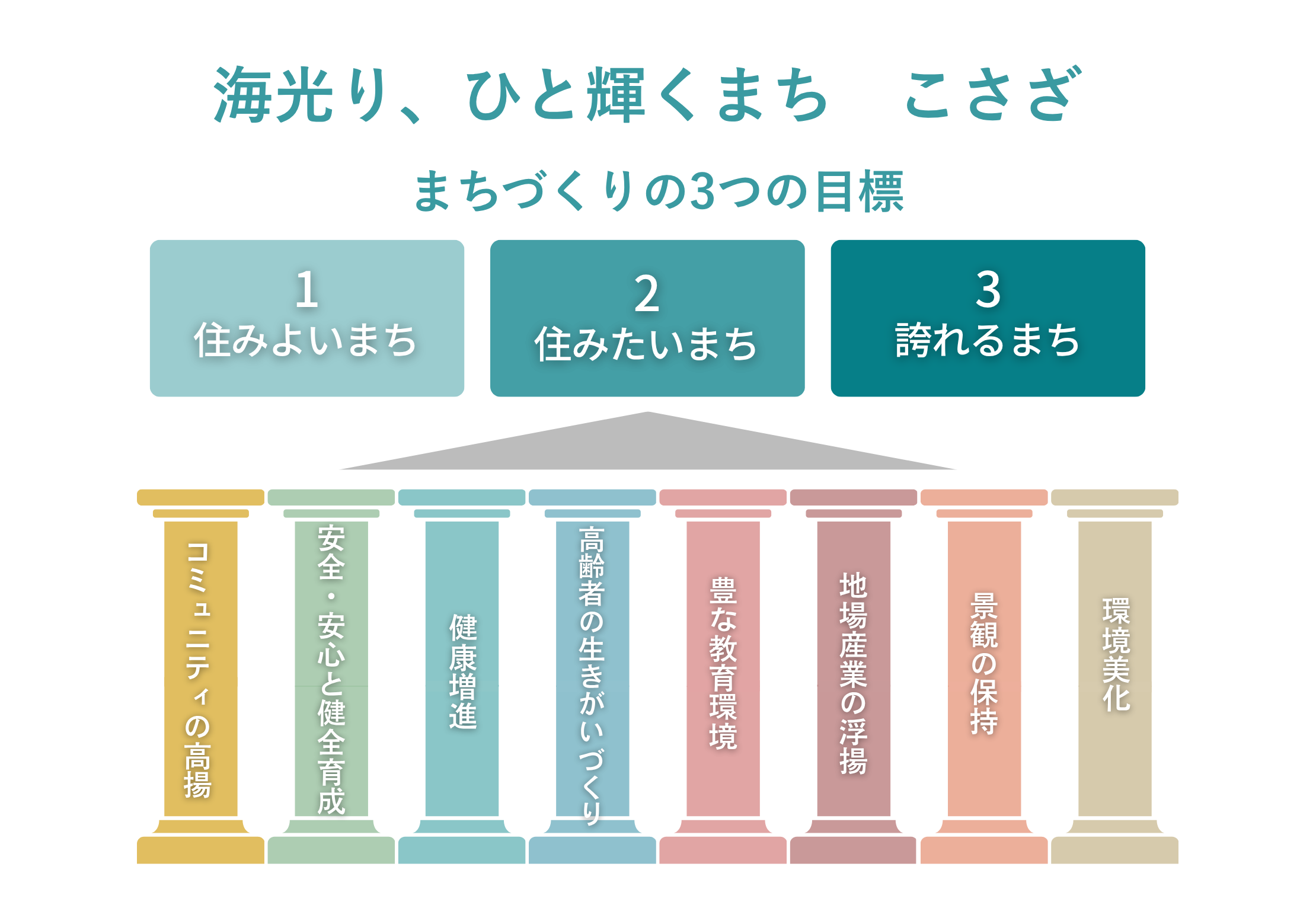 こさたん「海光り ひと輝くまち こさざ」をスローガンに、まちづくりの目標として「住みよいまち」「住みたいまち」そして「誇れるまち」を設定しました。これらを実現する基本目標として以下の8つの基本目標を掲げ、取り組んでまいります。