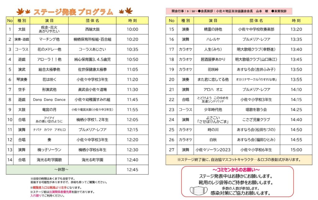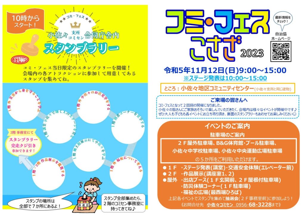 コミ・フェスこさざ2023のステージプログラムができました(11/8一部変更版) 2025 8/28 イベント情報 コミ・フェス こさざ 2023年11月8日2025年8月28日 問い合わせ・申込みは小佐々コミセンへ☎0956-68-3228 イベント情報 コミ・フェス こさざ よかったらシェアしてね! URLをコピーしました! URLをコピーしました! 関連記事 小佐々町で夏祭りが開催されます! 5月11日開催『西の最果てマルシェ』チラシができました 西の最果てマルシェ、2回目開催します! グッチョが優勝 ~親睦ソフトバレーボール大会 第2回親睦ソフトバレーボール大会のトーナメント決定しました スマホ教室を開催します 第2回小佐々地区親睦ソフトバレーボール大会を開催します! 新着コミセン講座情報