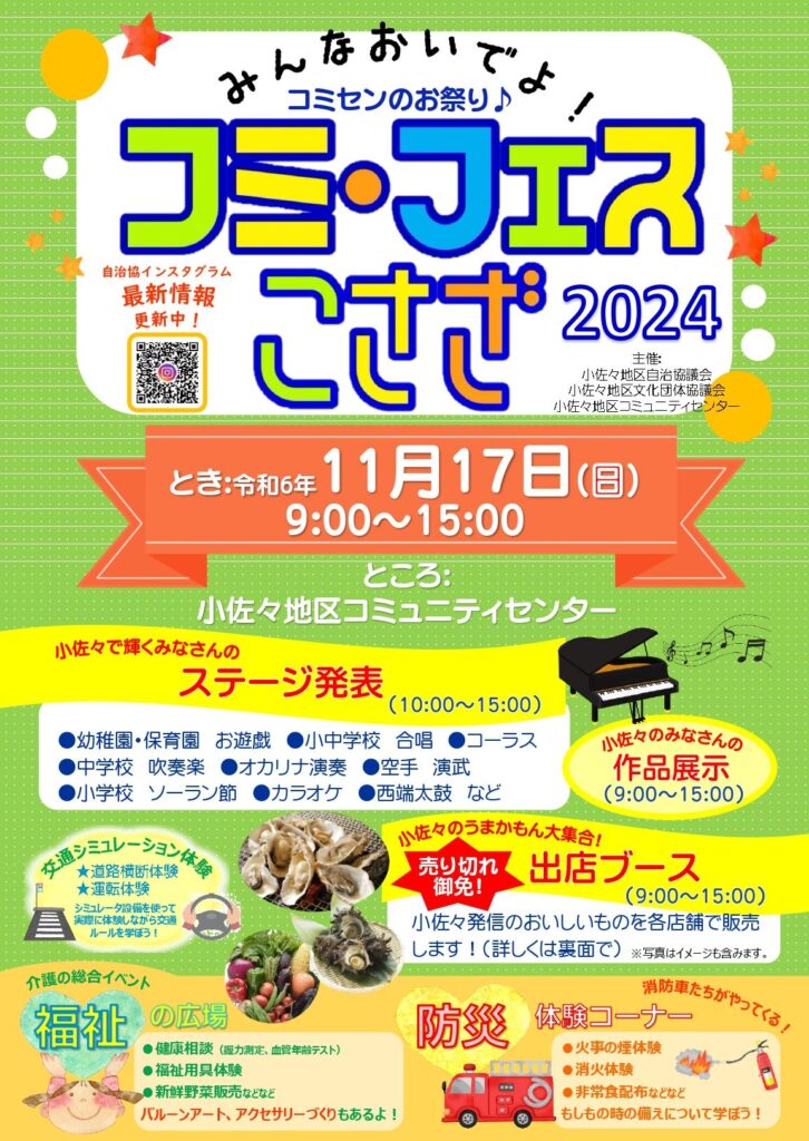 コミ・フェスこさざ2024 を開催します 2025 8/28 イベント情報 コミ・フェス こさざ 2024年10月28日2025年8月28日 11月17日(日)、午前9時から小佐々地区コミュニティセンターでコミ・フェスこさざ2024を開催します。皆さまお誘いあわせの上、ご来場ください。 問い合わせ・申込みは小佐々コミセンへ☎0956-68-3228 イベント情報 コミ・フェス こさざ よかったらシェアしてね! URLをコピーしました! URLをコピーしました! 関連記事 小佐々町で夏祭りが開催されます! 5月11日開催『西の最果てマルシェ』チラシができました 西の最果てマルシェ、2回目開催します! グッチョが優勝 ~親睦ソフトバレーボール大会 第2回親睦ソフトバレーボール大会のトーナメント決定しました スマホ教室を開催します 第2回小佐々地区親睦ソフトバレーボール大会を開催します! 新着コミセン講座情報