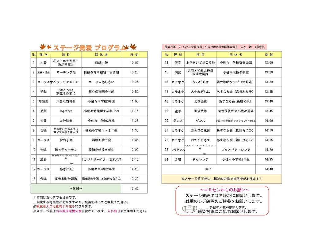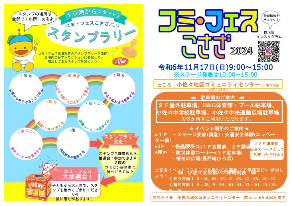「コミ・フェスこさざ2024」のプログラムができました 2025 8/28 イベント情報 コミ・フェス こさざ 2024年11月8日2025年8月28日 問い合わせ・申込みは小佐々コミセンへ☎0956-68-3228 イベント情報 コミ・フェス こさざ よかったらシェアしてね! URLをコピーしました! URLをコピーしました! 関連記事 小佐々町で夏祭りが開催されます! 5月11日開催『西の最果てマルシェ』チラシができました 西の最果てマルシェ、2回目開催します! グッチョが優勝 ~親睦ソフトバレーボール大会 第2回親睦ソフトバレーボール大会のトーナメント決定しました スマホ教室を開催します 第2回小佐々地区親睦ソフトバレーボール大会を開催します! 新着コミセン講座情報