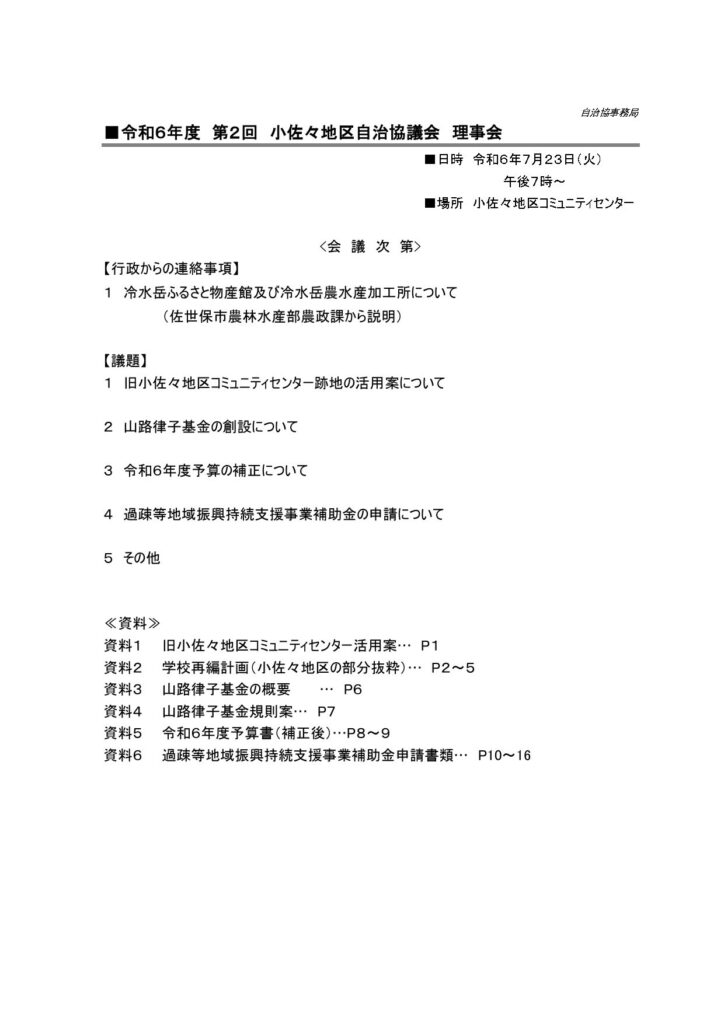 7月23日、小佐々地区コミュニティセンターで小佐々地区自治協議会令和6年度第2回理事会を開催しました。旧小佐々地区コミュニティセンター跡地の活用やアメリカ在住の山路律子さんからの寄付に伴う基金の規則の制定など4つの議題が審議され、いずれもほぼ原案どおり承認されました。
