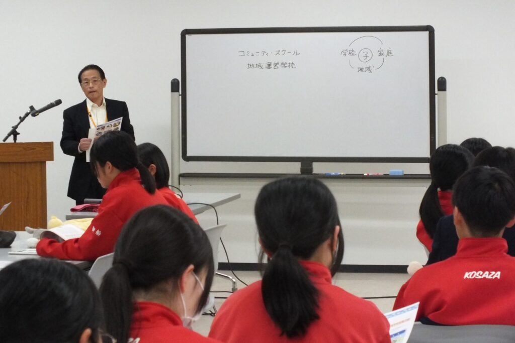 講座では、小佐々地区自治協議会会長で新田地区会会長の山本敏さんが、動画やスライドを使って町内会などの活動を紹介。続いて、佐世保市地域学校協働活動推進員の野間健司さんが、町内の小・中学校で取り組んでいる地域学校協働活動(コミュニティスクール)について、地域の人が授業や登校時の見守りに協力していることなど、小・中学生は地域からも支えられていることを伝えました。