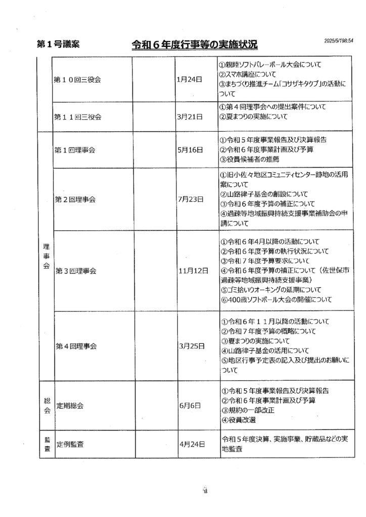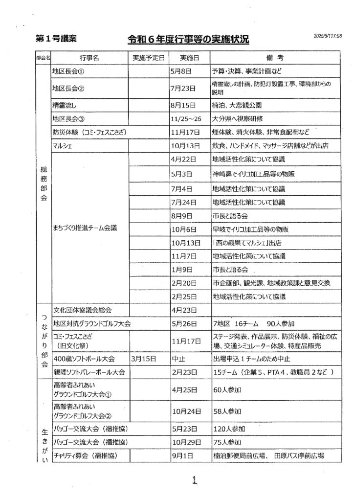 令和7年度 定期総会を開催しました 2025 8/22 街のくらし コミセン 2025年6月24日2025年8月22日 小佐々地区自治協議会総会を6月5日、小佐々地区コミュニティセンターで開催しました。令和6年度事業・決算報告と令和7年度事業計画案・予算案審議などを行い、原案どおり承認されました。資料は添付のとおりです。 問い合わせ・申込みは小佐々コミセンへ☎0956-68-3228 街のくらし コミセン よかったらシェアしてね! URLをコピーしました! URLをコピーしました! 関連記事 6年ぶりに「子ども劇場」を開催 小佐々地区住民の交通手段の確保に向けた研修会を開催しました 生まれ育った町で成人式典 ~2025小佐々20歳を祝う会~ 中学生が地域の支え合いの仕組みなどを学びました 小佐々中吹奏楽部&SASEBO響団が合同でコンサートを開催しました 各地区で敬老会が開催されました 旧小佐々地区コミュニティセンターの跡地活用策について佐世保市へ要望 港町地区で夏まつりが開催されました
