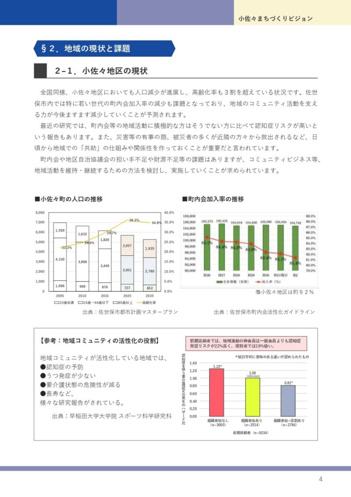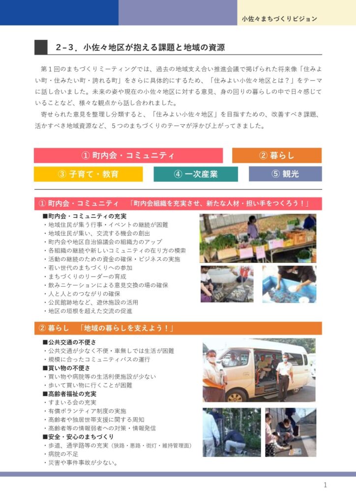 将来にわたり、小佐々地域が活気のある”まち”であり続けることを願って、地域の課題や目指すべき将来像をまとめた「小佐々まちづくりビジョン」を令和5年3月につくりました。