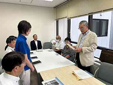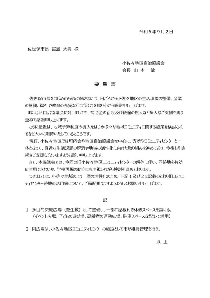 9月2日、佐世保市役所において、旧小佐々地区コミュニティセンターの解体に伴う跡地活用策に関する佐世保市長への要望書を山本会長が中西市民生活部長に直接手渡しました。同センターの解体工事は、今月上旬に着手、来年1月中に終了の予定で進められています。